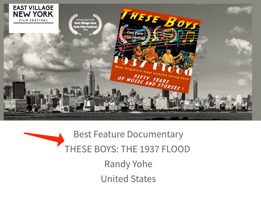 “These Boys,” Randy Yohe’s new documentary about the 50-year history of The 1937 Flood, continues to receive kudos. We learned today that the film is now the January selection for “Best Feature Documentary” in the East Village New York Film Festival.