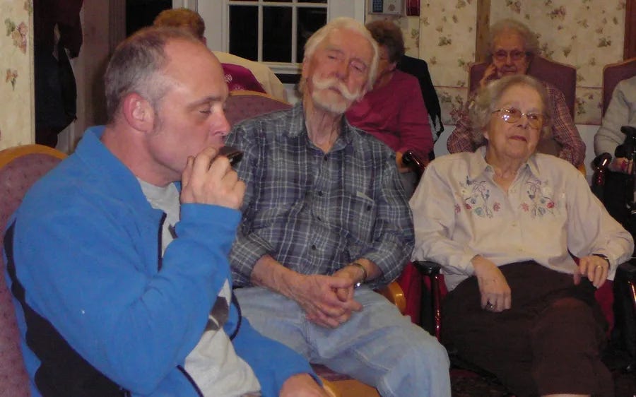 That night the guys arrived to find the Wyngate clubhouse was very nice, with wonderful acoustics. Norm had already rearranged the furniture. For the fun evening, about 30 of the Davises’ new neighbors were in the audience, among them Jacob’s grandparents who were also new Wyngate residents.