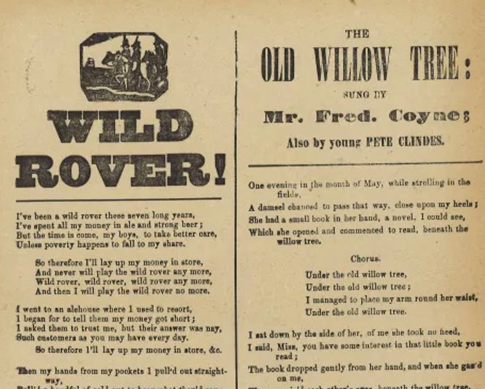 The irony of “The Wild Rover,” of course, is that it is a drinking song about not drinking. (No, nay, never, indeed!) That’s because as it circulated globally, spreading through Scotland and on to America, it was championed as a temperature song. An early US printing appeared in the 1845 book The American Songster.